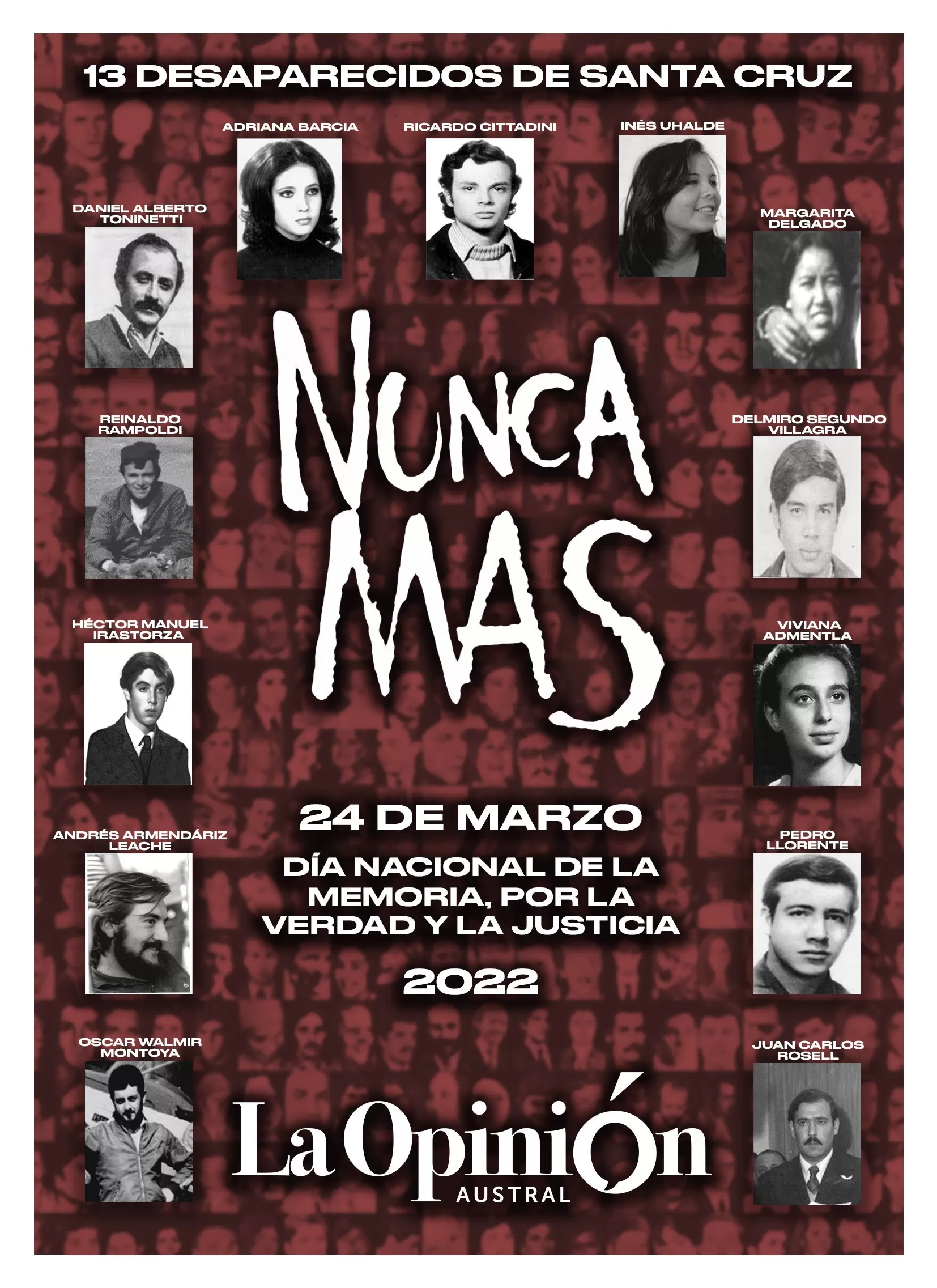 La Opinión Austral | Noticias | Tapas LA OPINIÓN AUSTRAL Tapa especial de La Opinión Austral del jueves 24 de marzo de 2022 por el Día Nacional de la Memoria por la Verdad y la Justicia 13 desaparecidos de Santa Cruz. Por La Opinión Austral | 24 de marzo 2022 · 1:30 hs. EN ESTA NOTA Tapas Leé más notas de La Opinión Austral Compartir esta noticia WhatsApp Facebook Ver comentarios