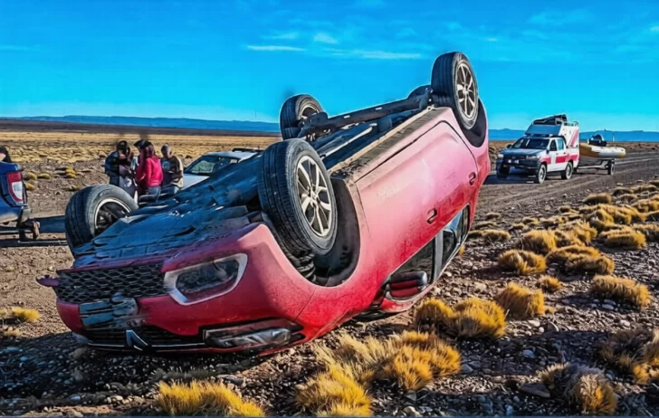 El hecho ocurrió cuando un automóvil Renault Sandero de color rojo realizó una maniobra evasiva ante la presencia de un guanaco, lo que provocó la pérdida de control y el posterior vuelco del rodado, que quedó con las ruedas hacia arriba.