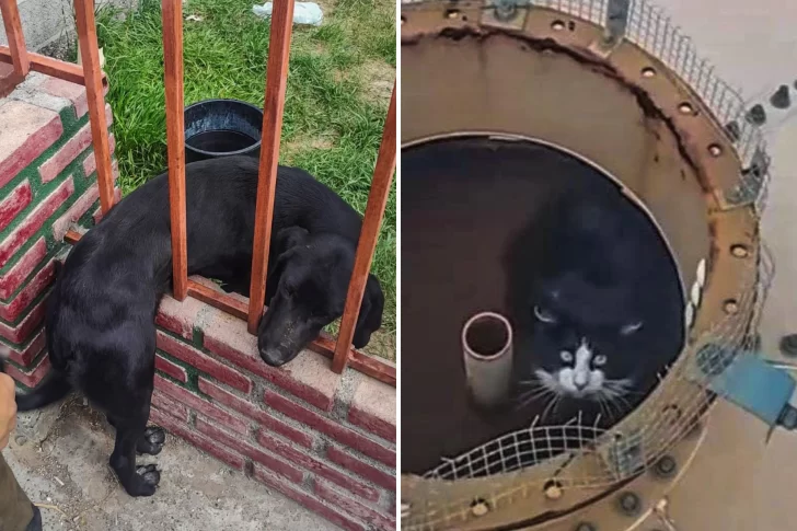 Bomberos de Santa Cruz protagonizaron dos rescates de animales este jueves cerca del mediodía. Uno ocurrió en Pico Truncado, donde un perro quedó atascado en un portón, y el otro en Puerto Deseado, luego de que un gato quedara atrapado en un tanque de agua.