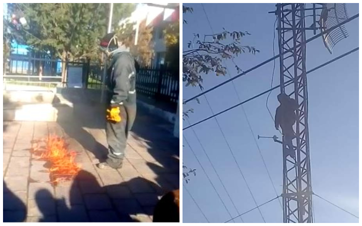 Otra situación de peligro se vivió cuando un desocupado decidió, por su parte, treparse a una enorme antena de alta tensión. En el video, apenas puede verse a la persona colgada entre los fierros, a manera de protesta.