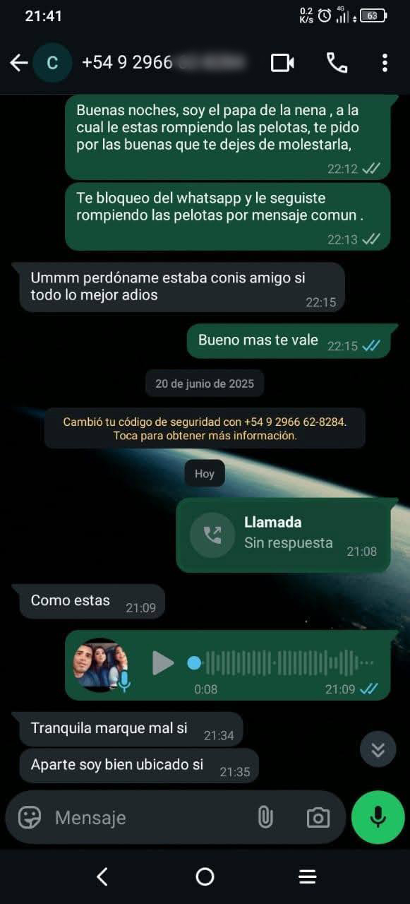 De acuerdo a la información a la que tuvo acceso La Opinión Austral, se pudo saber que la joven tiene 12 años y, tal como se subraya en el mensaje original, el hombre fue advertido de su edad, sin embargo, insistió en sus contactos. “Ya se le había advertido que deje de molestar y la edad que tenía mi hermana”, se lee en el texto, que rápidamente fue compartido por decenas de vecinos preocupados por la posibilidad de que otras chicas estén siendo víctimas del mismo individuo.