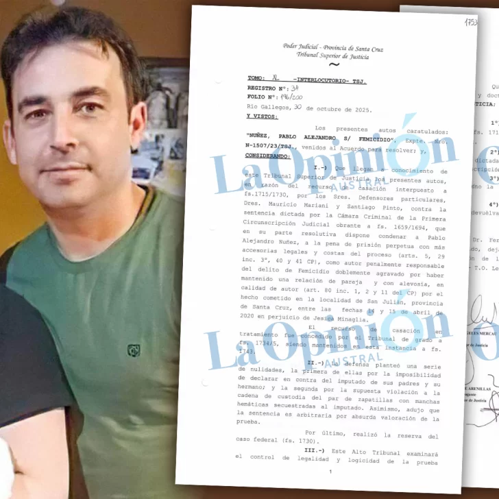 El Tribunal Superior de Justicia de Santa Cruz confirmó en todas sus partes la condena a prisión perpetua contra Pablo Alejandro Núñez, exintegrante de la Policía de Santa Cruz, hallado culpable del femicidio doblemente agravado de Jesica Minaglia, ocurrido en la localidad de Piedra Buena entre el 14 y el 15 de abril de 2020.