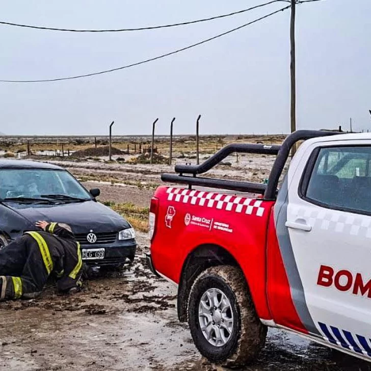 Bomberos de Puerto Santa Cruz asistieron el lunes por la tarde a un conductor que había quedado varado en el barro.