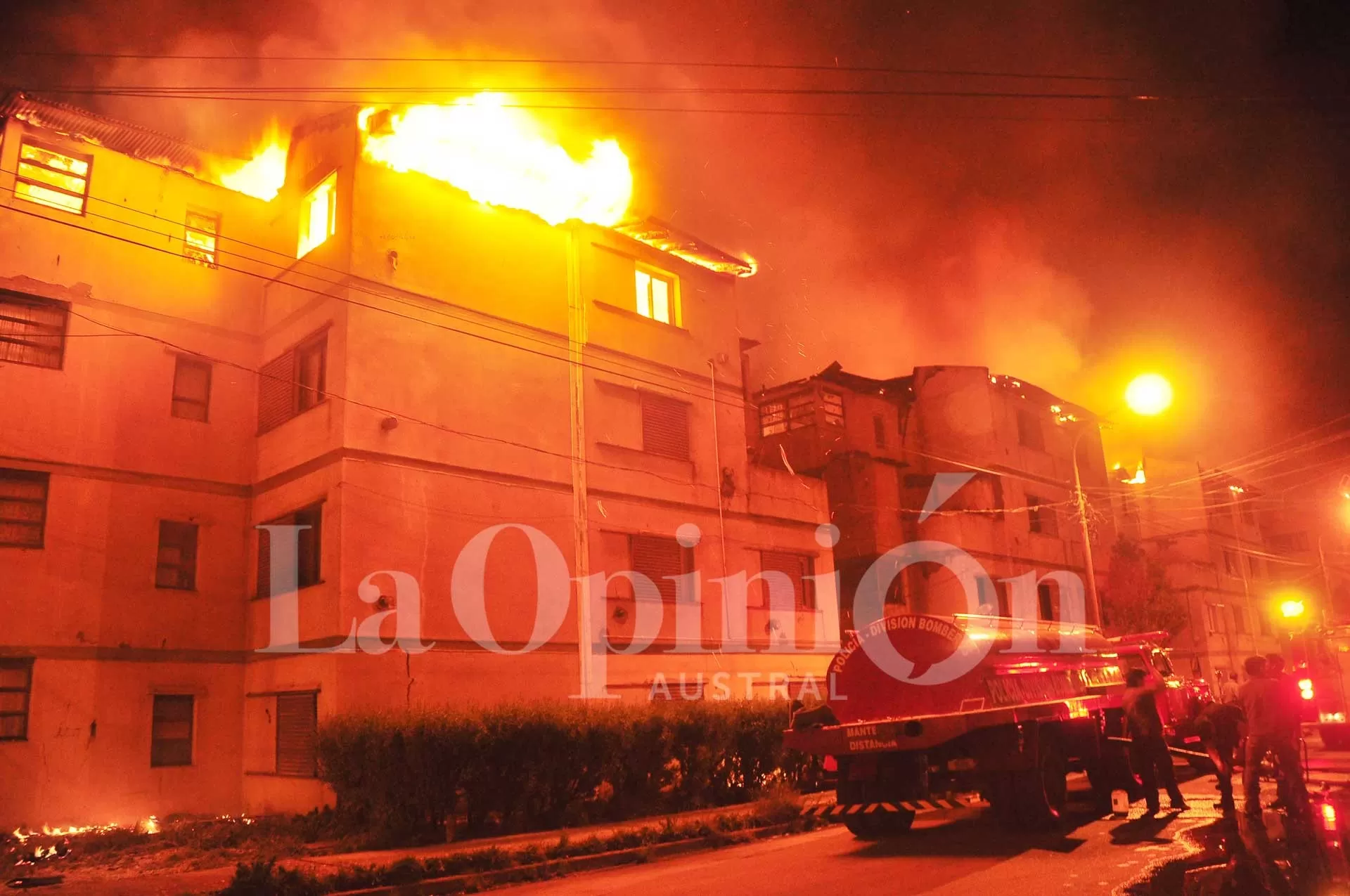 El fuego se expandió rápidamente entre los edificios ubicados entre calle Ameghino y pasaje Fátima. Afectó a 8 departamentos de cuatro módulos y dejó a cerca de 24 familias sin techo.