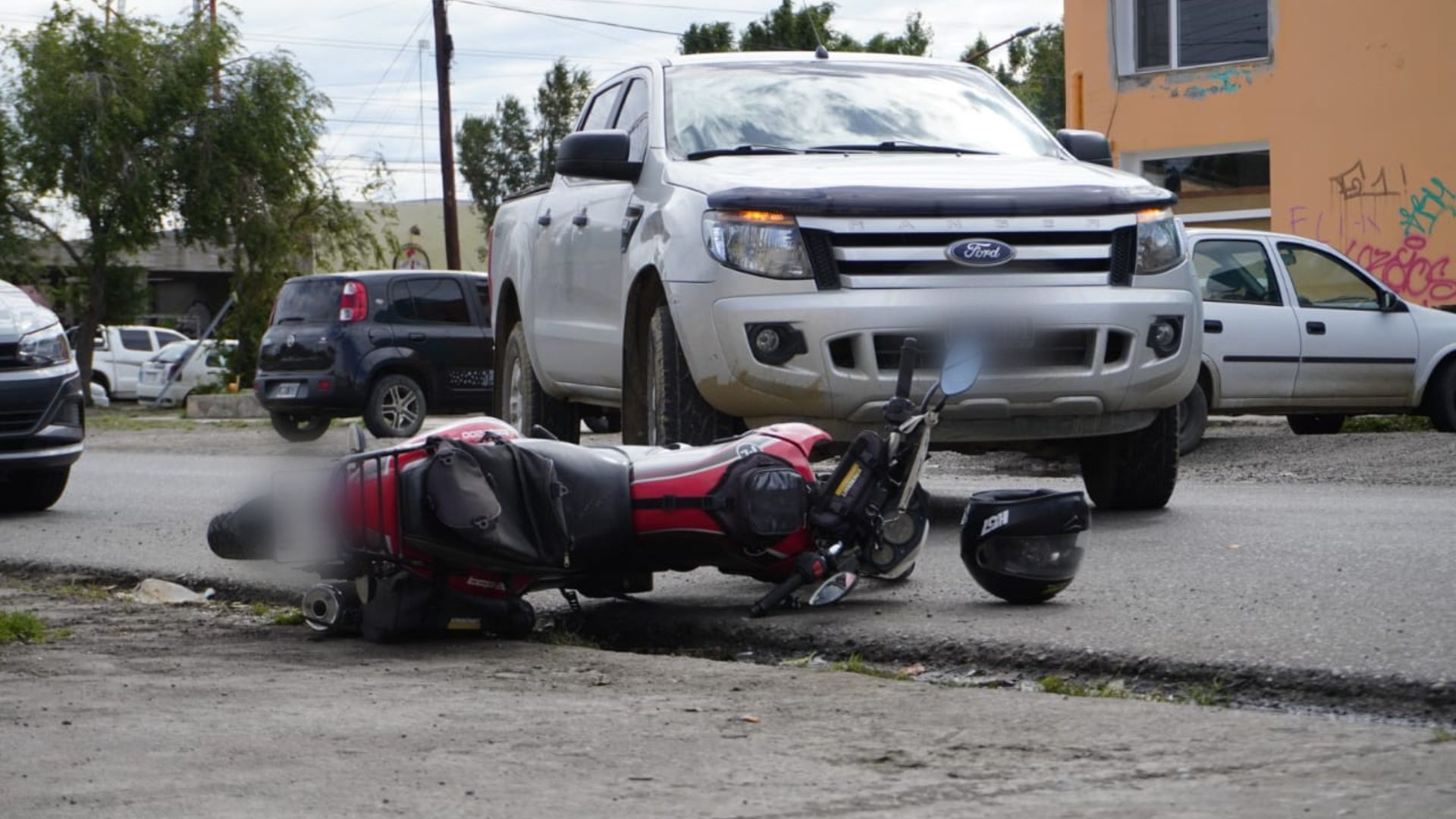 Este jueves, se registraron una serie de siniestros viales en la ciudad de Río Gallegos. Uno de ellos, tuvo lugar en la calle Don Bosco, a metros de la intersección con la calle Chile. El choque fue protagonizado por una camioneta Ford Ranger y una motocicleta marca Motomel.