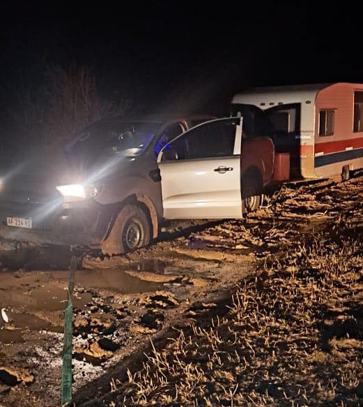 Según pudo saber La Opinión Austral, el hecho involucró a una pareja de turistas oriundos de Caleta Olivia que se desplazaban a bordo de una camioneta Ford Ranger, con una casilla rodante enganchada, cuando quedaron atrapados en un sector lodoso sin posibilidad de tracción. La combinación del peso del vehículo, el remolque y las características del suelo hizo imposible que pudieran salir por sus propios medios, lo que motivó el pedido de auxilio a los servicios de emergencia.