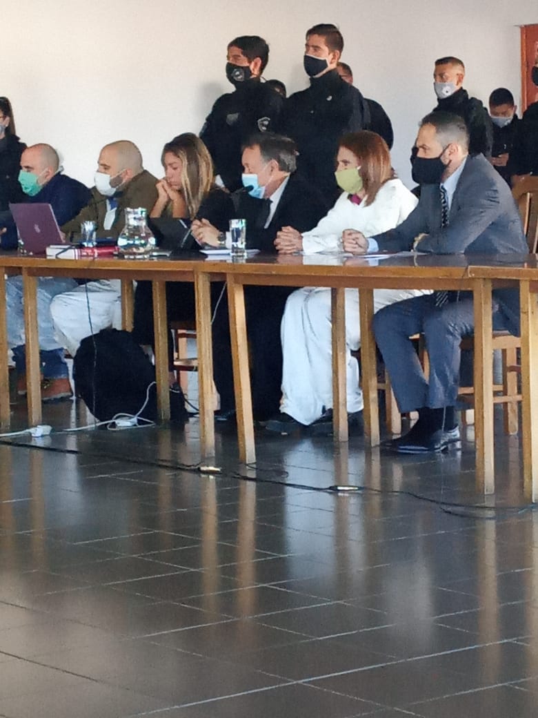 Los imputados junto a sus abogados, en el salón de la Escuela de Policía. FOTO: MIRTA VELÁSQUEZ / LA OPINIÓN AUSTRAL.