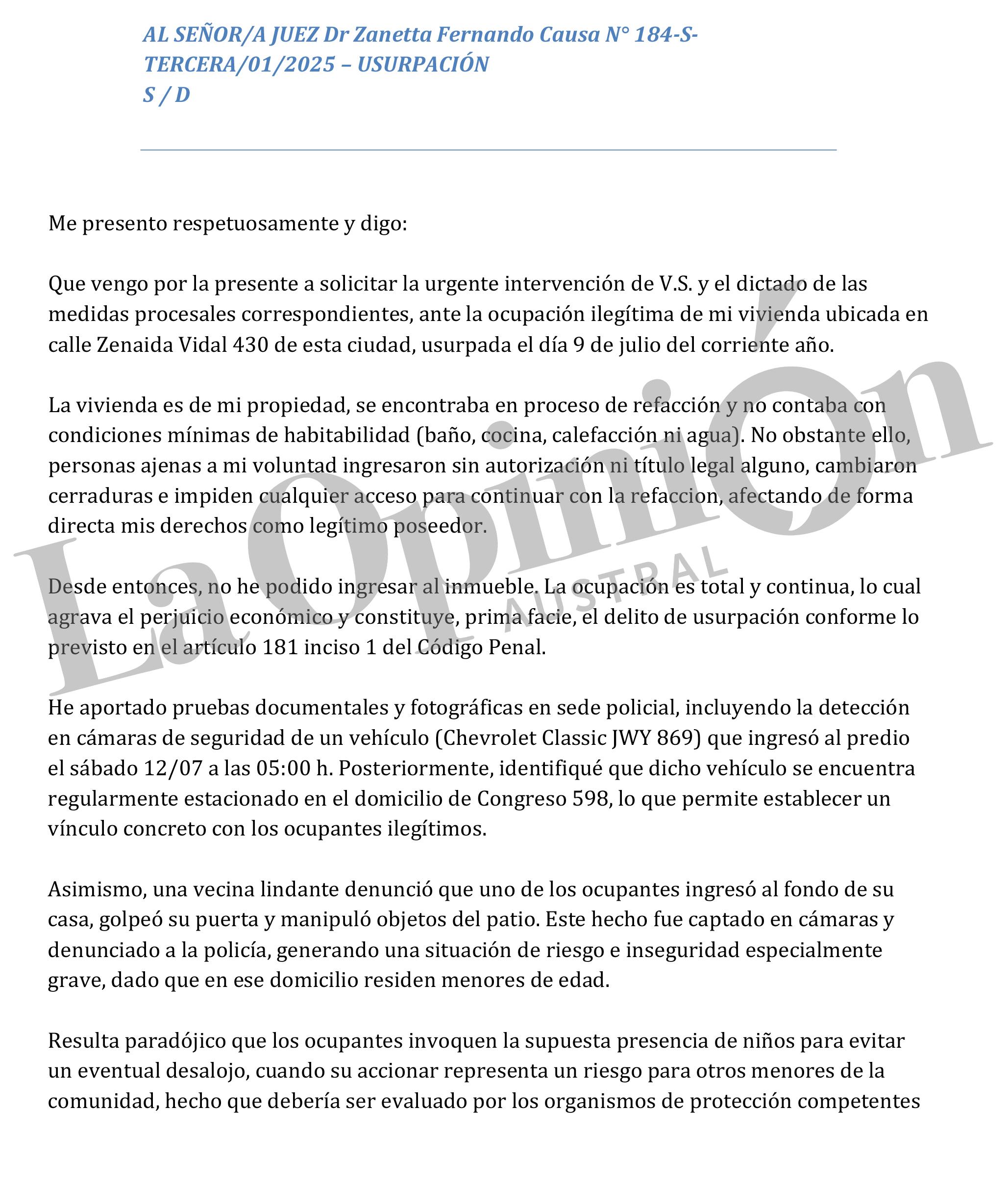 En la presentación judicial realizada ante el juez Fernando Zanetta, Gelves solicitó una intervención urgente y también el dictado de medidas que permitan restituir el inmueble a su dueño. Señaló que desde el 9 de julio la ocupación es “total y continua”, generando un perjuicio económico directo y configurando, según su entendimiento, el delito de usurpación.