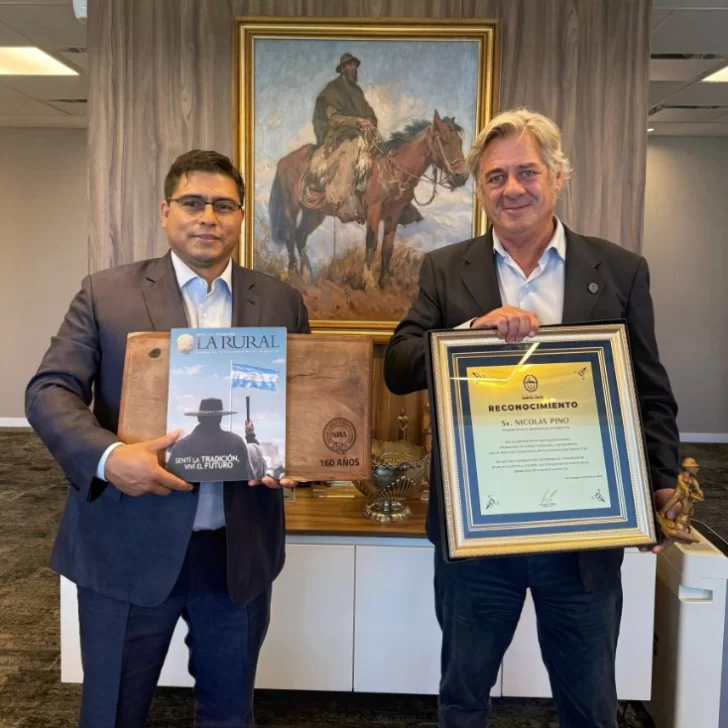 En la imagen se puede ver al gobernador de Santa Cruz con un libro de La Rural llamado “Sentí la Tradición, viví el futuro”; mientras que Enrique Pino tiene en sus manos un cuadro con un reconocimiento por parte de la provincia.