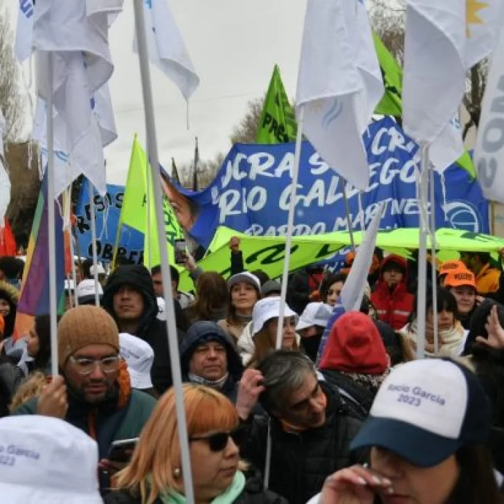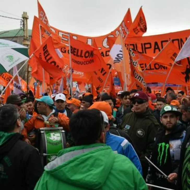 Antes de las 15 horas los grupos de manifestantes de los diferentes sectores que apoyan al candidato a gobernador se fueron concentrando sobre la Avenida Orkeke. Una columna con jóvenes abrigados con camperas naranjas todas iguales fueron desde la costanera hacia la calle donde los esperaba un grupo con banderas de la UOCRA de Río Gallegos.