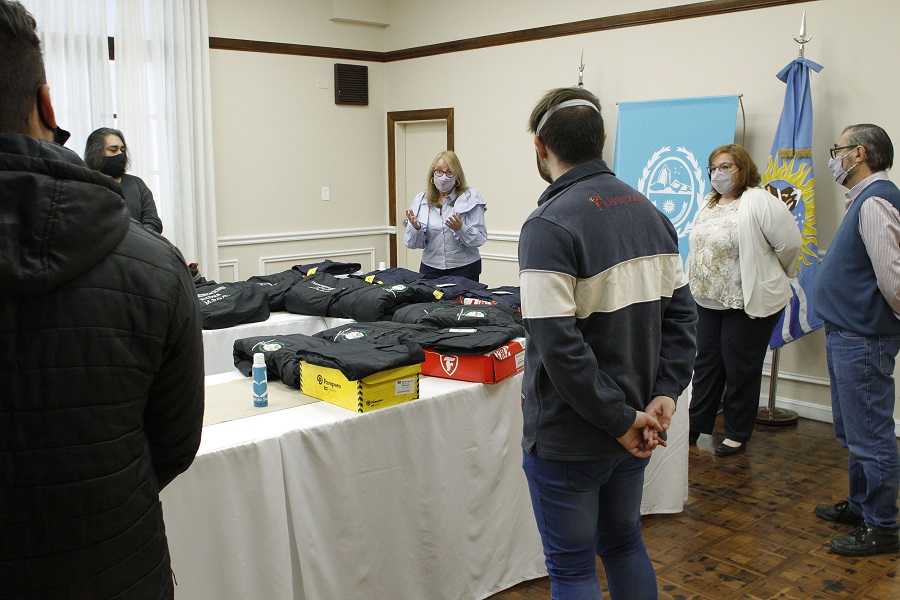 La gobernadora Alicia Kirchner hizo entrega de indumentaria y el equipamiento necesario para quienes llevan adelante trabajo en alturas, en un acto en el que estuvo acompañada por la secretaria general de la Gobernación, Claudia Martínez, el subsecretario de Telecomunicaciones, Oscar Trucco.
