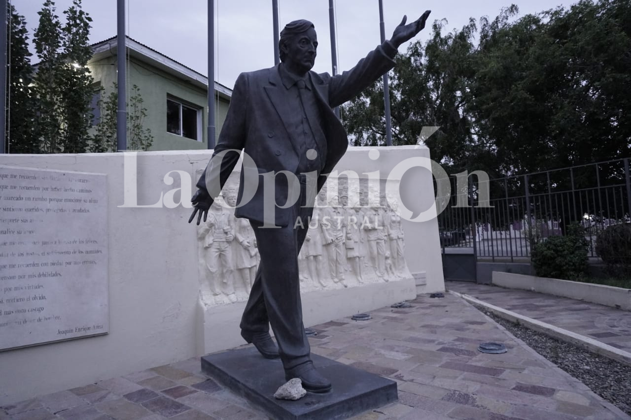 Según se puede ver en las imágenes a las que tuvo acceso La Opinión Austral, alguien le habría arrojado una roca, lo que provocó que parte de brazo derecho de la figura quede rasgada y que el dedo índice se desprenda. Además, se robaron una de las placas conmemorativas colocadas en el paredón tras la escultura.