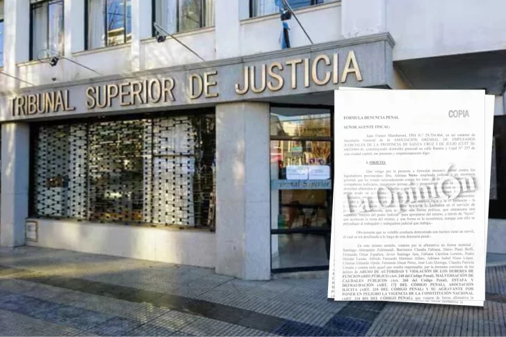 La Asociación Gremial de Empleados Judiciales de la Provincia de Santa Cruz (AGEJ) presentó una denuncia penal contra legisladores provinciales por autorizar el pago del 50% del sueldo a los cuatro nuevos vocales del Tribunal Superior de Justicia (TSJ): José Antonio González Nora, Sergio Acevedo, Juan Lucio De la Vega y Gabriel Contreras.