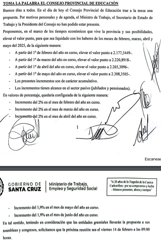 En la reunión, el Consejo Provincial de Educación, representado por el Prof. Oscar Barrientos, la Sra. Sonia Rodríguez, la Sra. Rosa Villaseca y la Ing. Romina Santarelli, planteó un esquema de incremento del valor punto: