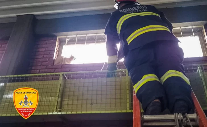 Un peculiar rescate animal tuvo lugar este lunes 6 de abril en la localidad de Puerto Deseado. Bomberos lograron salvar a un gato que había quedado atrapado en la Escuela N° 5.