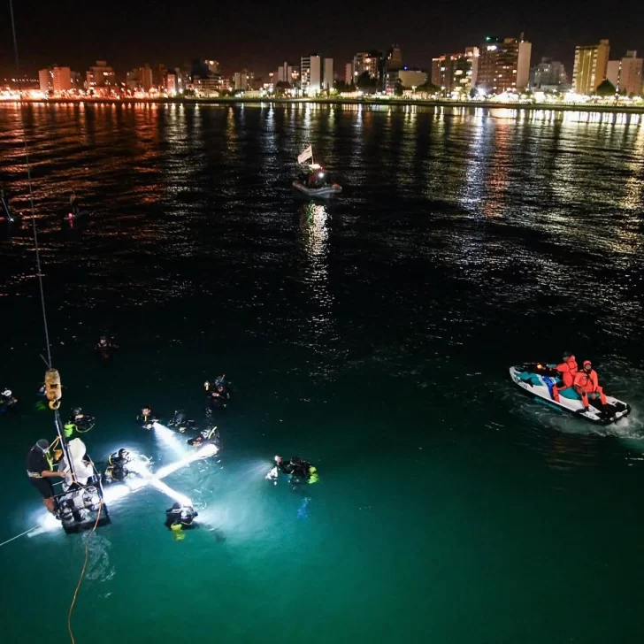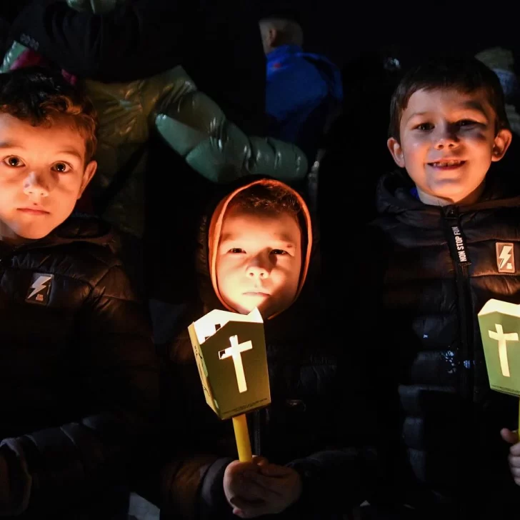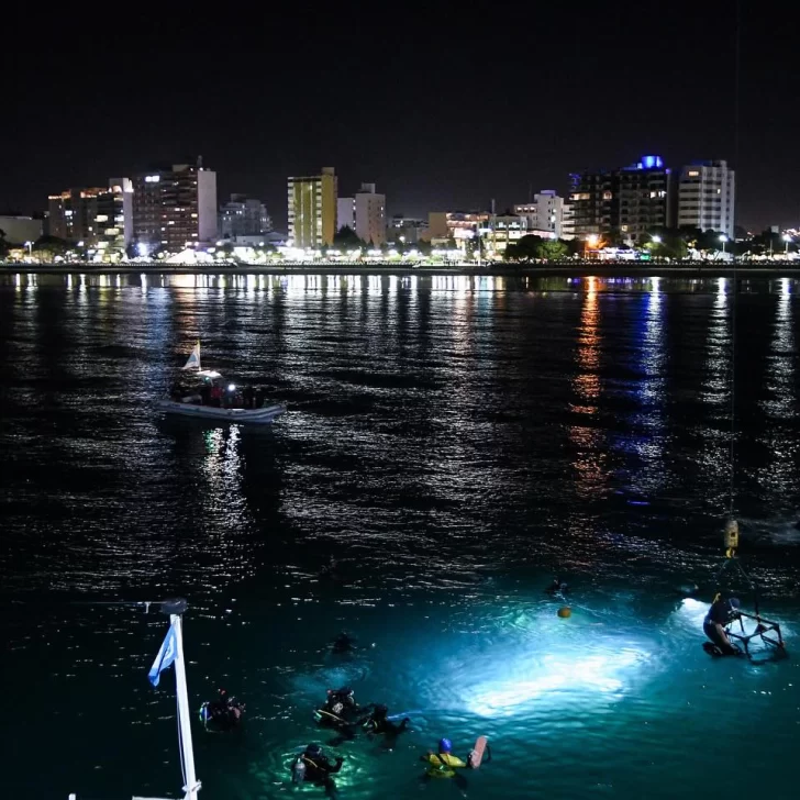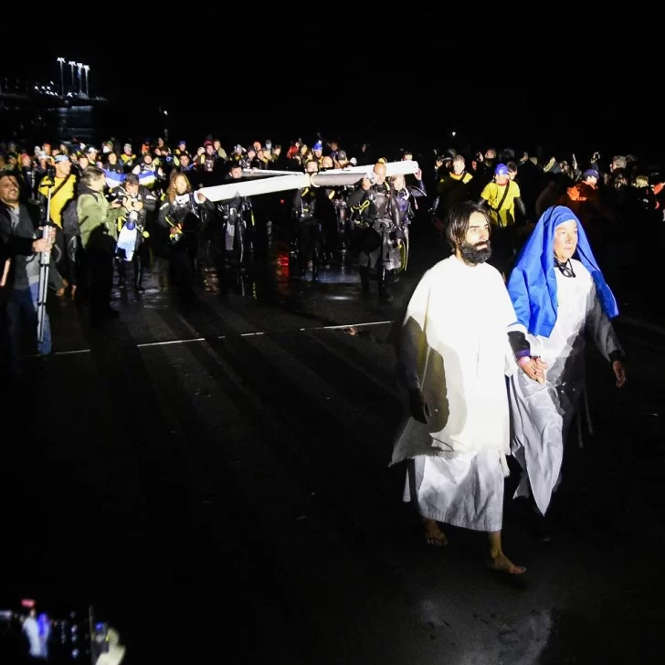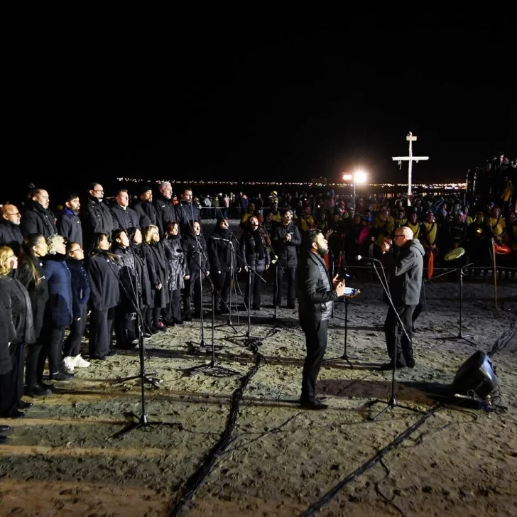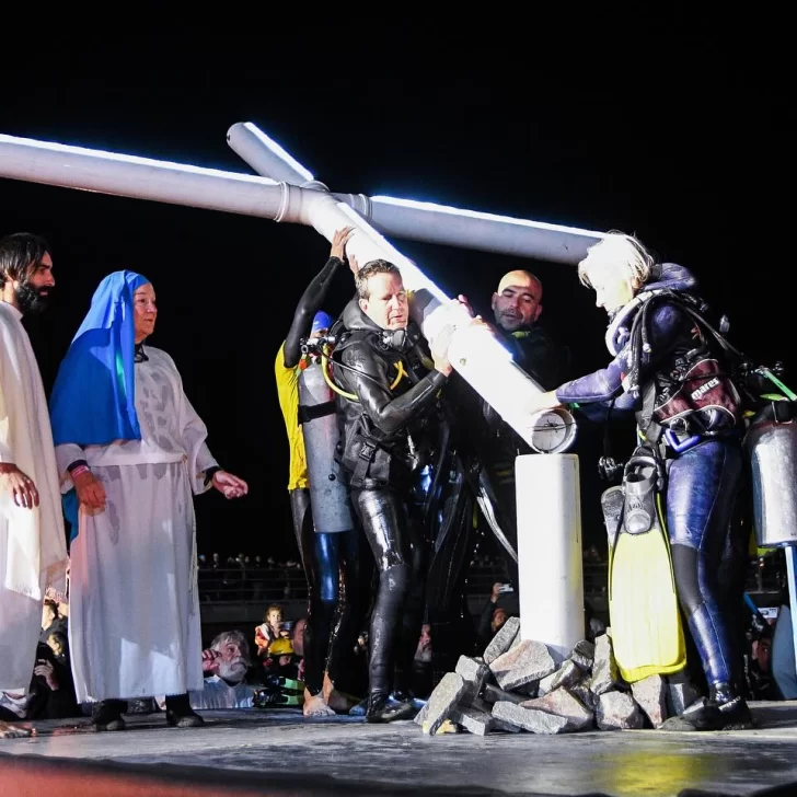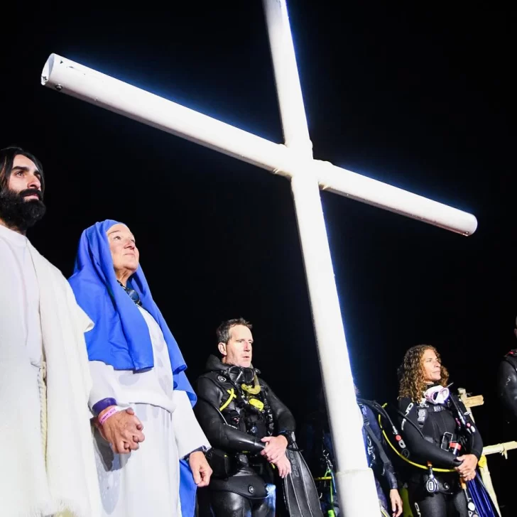 Ya en la costa, con el cielo completamente oscuro y el mar en calma, el momento más simbólico comenzó. Una cruz iluminada descendió lentamente en las aguas del Golfo Nuevo, acompañada por buzos profesionales, nadadores, kayakistas y embarcaciones sin motor. En tanto, un sacerdote transmitía la lectura de la Pasión, Muerte y Resurrección de Cristo desde tierra firme, a través de un hidrófono que llevaba el mensaje hasta los protagonistas en el agua.