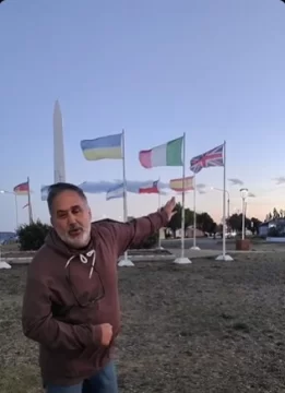 “Qué bandera tenemos ahí manga de h…s de p… se olvidaron de que nosotros fuimos a Malvinas a combatir, murieron nuestros compañeros, quedamos heridos con secuelas graves”, expresa ofuscado al exhibir la insignia inglesa en la Plaza del Inmigrante en la localidad de Puerto San Julián, provincia de Santa Cruz.
