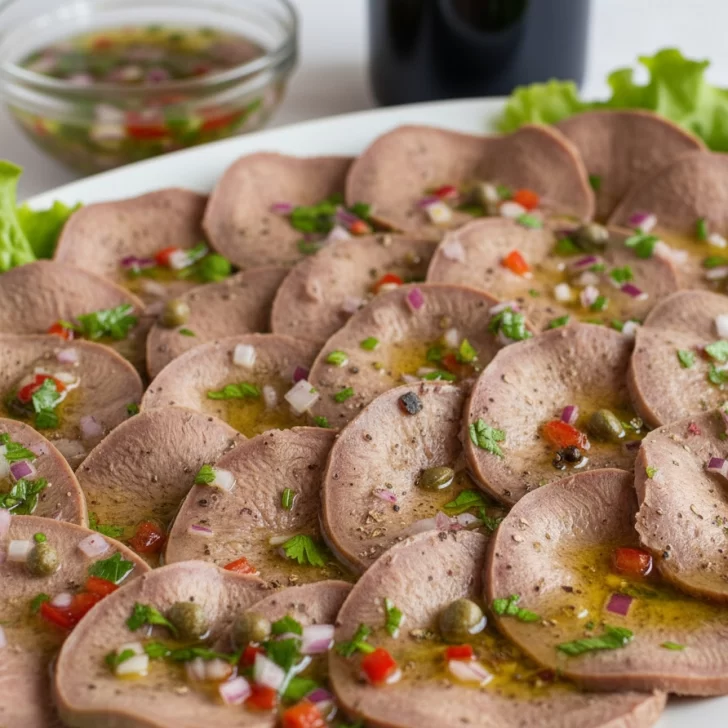- Volcar la vinagreta sobre las rodajas de lengua y llevar a la heladera tapada. Servir fría.