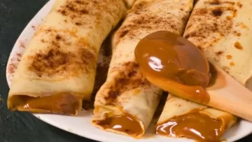 - Para la masa: batir los huevos y el azúcar. Incorporar la leche y la esencia de vainilla. Luego, agregar la harina. Batir hasta que no queden grumos. Dejar descansar al menos 20 minutos en la heladera.