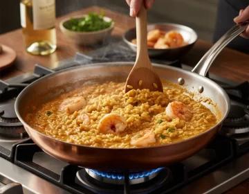 En la variante con camarones, el objetivo es lograr un equilibrio entre la textura del arroz y la cocción precisa del crustáceo para evitar una consistencia gomosa.
