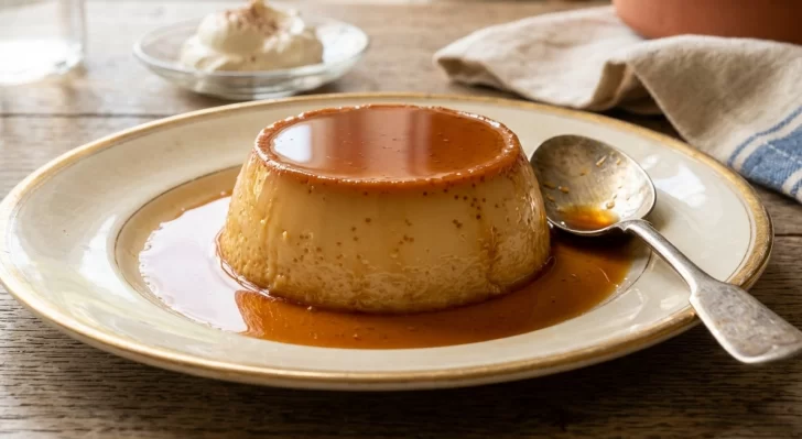Al momento de servir, el flan se desmolda cuidadosamente, invirtiéndolo sobre un plato para que el caramelo líquido cubra la superficie.
