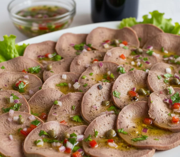 - Volcar la vinagreta sobre las rodajas de lengua y llevar a la heladera tapada. Servir fría.