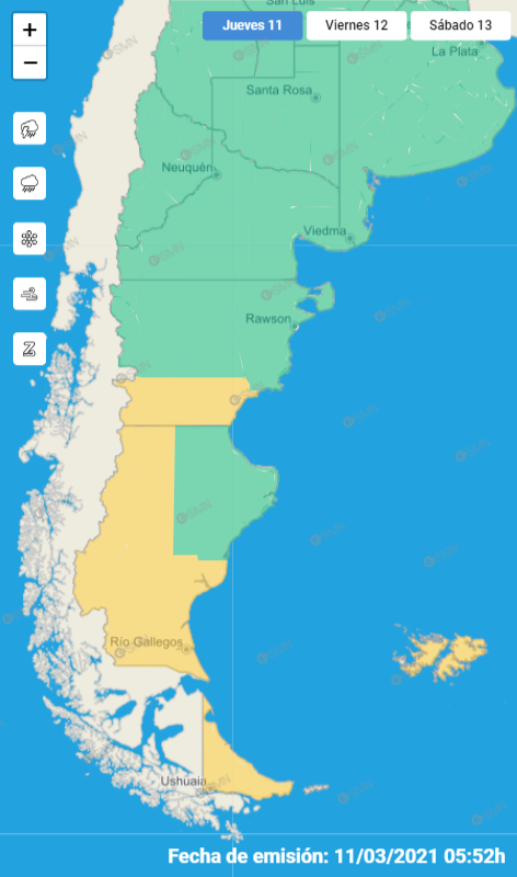 Según el informe del SMN, la costa de Güer Aike “continuará afectada por vientos del sector oeste con velocidades entre 50 y 75 km/h. con ráfagas entre 80 y 100 km/h”. A esto añado que “las velocidades más altas se esperan sobre el extremo sur de Santa Cruz, Tierra del Fuego e Islas Malvinas”.