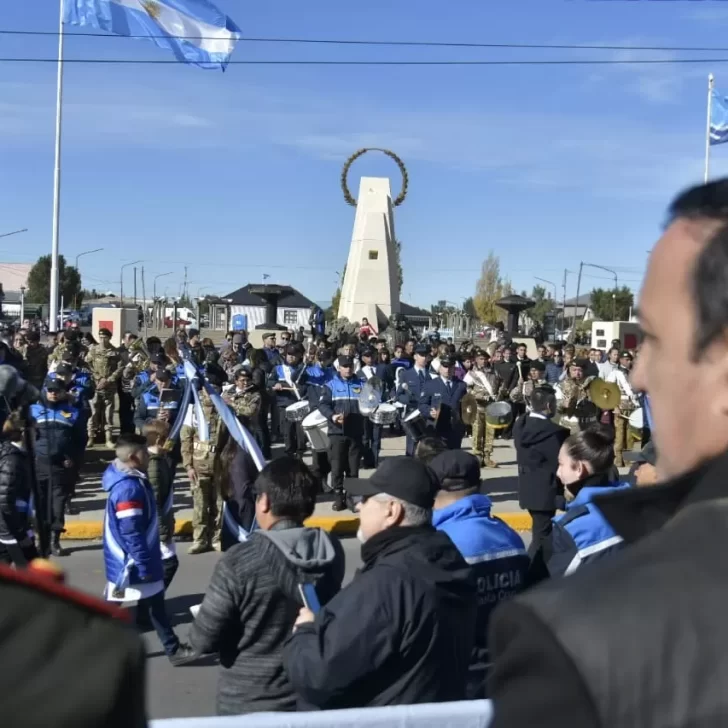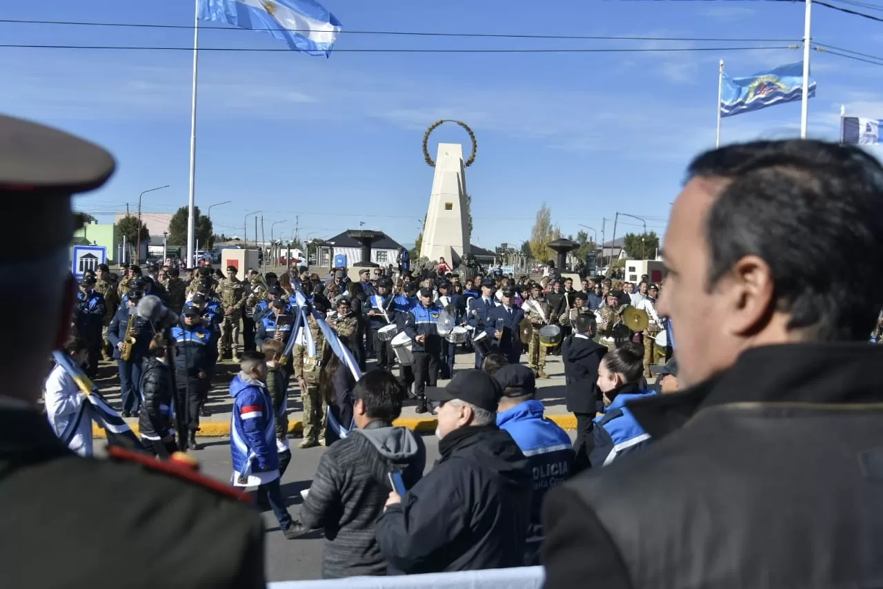 Para finalizar el acto, la banda del Ejército y de la Policía entonaron la Marcha de Malvinas, para acompañar el tradicional desfile cívico donde participan abanderados de todas las escuelas, jardines de infantes, y distintas instituciones de la localidad.