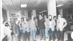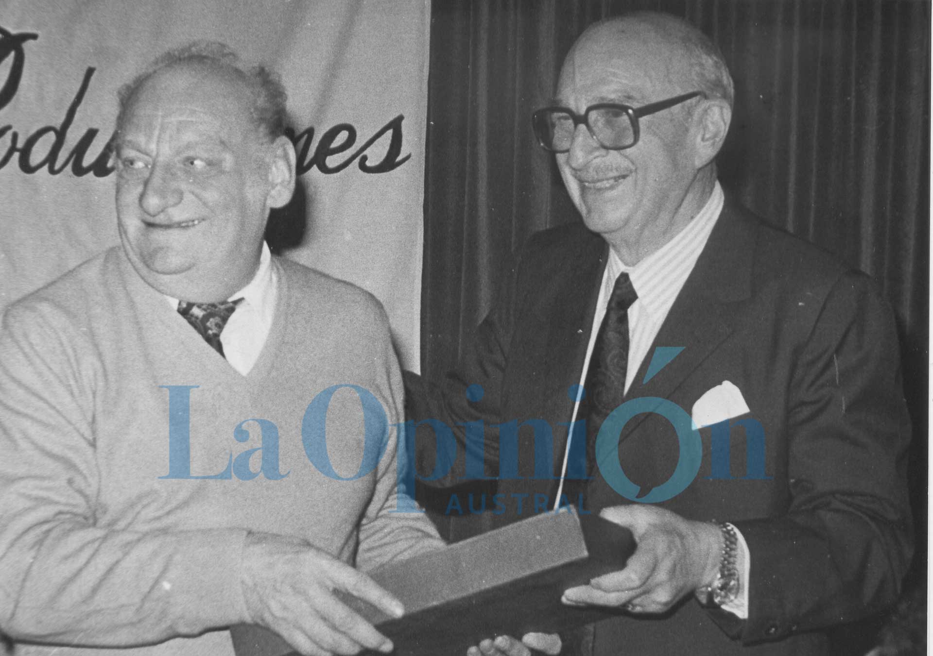 Alberto Raul Segovia entrega un presente al linotipista Benjamín Vogelmán.