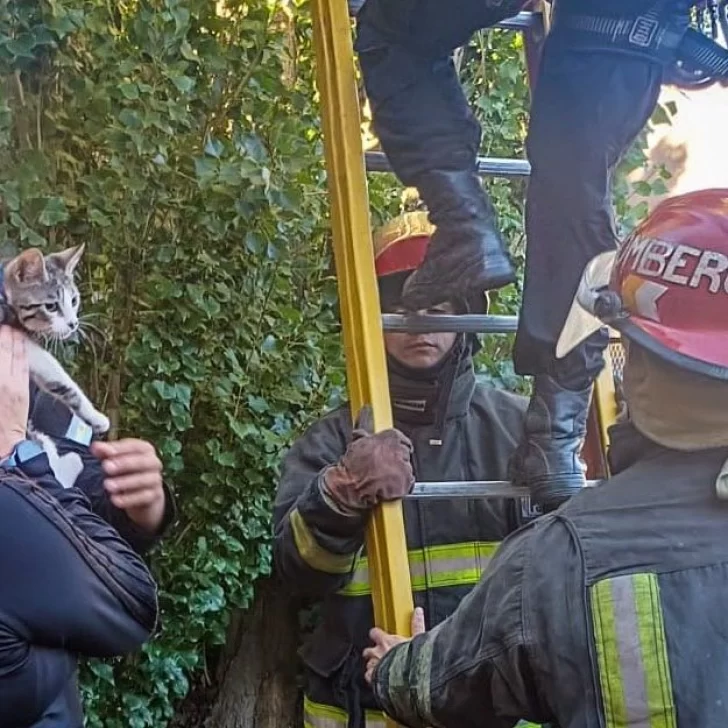 El equipo de la División Cuartel Uno de Bomberos de Río Gallegos recibió un llamado especial: un gatito aventurero se encontraba atrapado en la copa de un árbol en el patio de una vivienda ubicada en avenida Kirchner y no podía descender por sus propios medios.