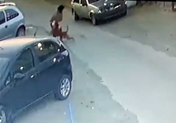 Parte del video difundido en redes. El perro le saltó a la señora mientras caminaba por la calle.