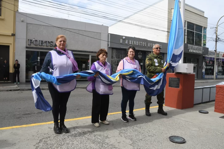 Integrantes del grupo mutua ayuda y de la Asociación Civil Buen Día Vida participaron este domingo del tradicional izamiento en el mástil central, ubicado en la intersección de las avenidas San Martín y Kirchner de Río Gallegos.