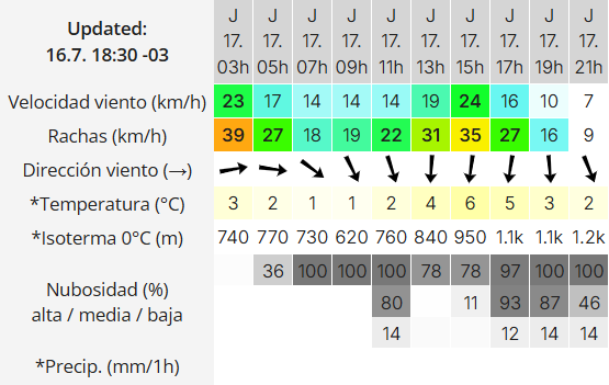 En la mañana, la temperatura descenderá hasta -1°C. El viento cambiará su dirección al Oeste (O), manteniendo velocidades de entre 23 y 31 km/h y ráfagas entre 42 y 50 km/h. Se mantendrá el cielo parcialmente nublado y no se esperan lluvias.