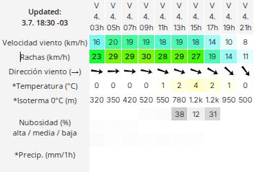 En la mañana, se espera una temperatura de -1°C. Con vientos -en dirección Sudoeste- que oscilarán entre los 23 y 31 km/h y ráfagas de hasta 59 km/h.