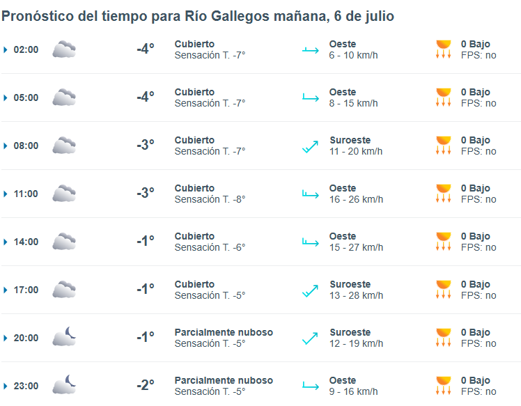 El Servicio Meteorológico Nacional (SMN) pronosticó para este domingo 6 de julio en la ciudad de Río Gallegos un día con temperaturas que irán desde los -5°C de mínima hasta los 1°C de máxima.