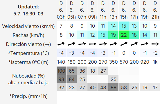 Hacia la noche, la temperatura bajará a -3 °C con vientos predominantes del Sudoeste de entre 13 y 22 km/h.