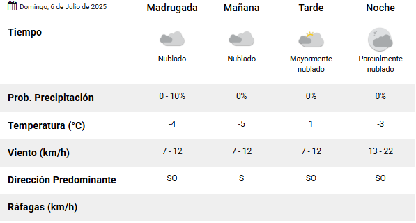 Durante la madrugada, la temperatura será de -4°C, con vientos del sector Sudoeste de entre 7 y 12 km/h. Habrá un 10% de probabilidad de precipitaciones.