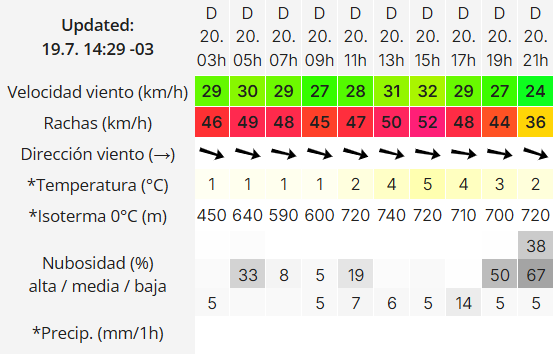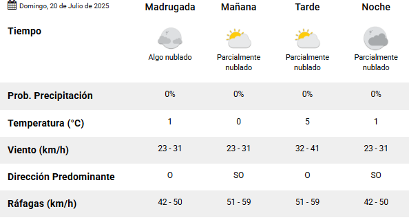 En la mañana, se espera una temperatura de 0°C. Con vientos -en dirección Sudoeste- que oscilarán entre los 23 y 31 km/h y ráfagas de hasta 59 km/h.