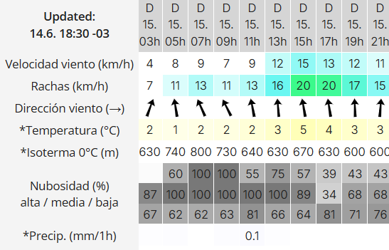 En la mañana, se espera una temperatura de -1°C. Con vientos -en dirección Sur- que oscilarán entre los 23 y 31 km/h y ráfagas de hasta 50 km/h. La probabilidad de precipitaciones será de 10%.