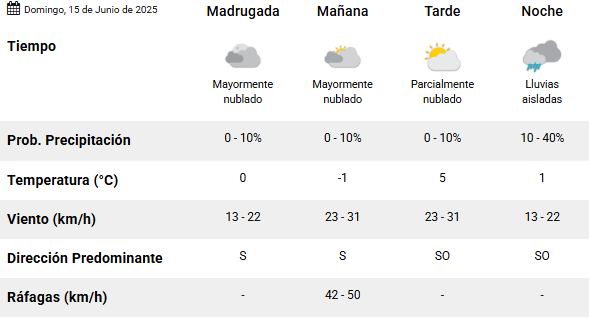 Durante la madrugada, la temperatura será de 0°C, con vientos del sector Sur de entre 13 y 22 km/h. Habrá un 10% de probabilidad de precipitaciones.