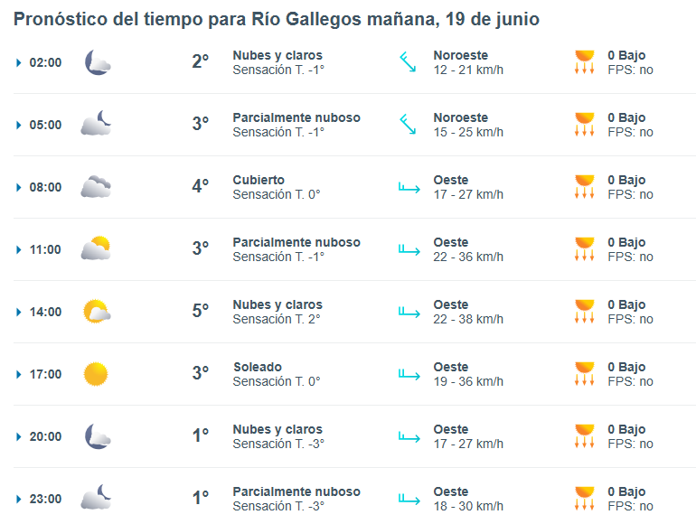 El Servicio Meteorológico Nacional (SMN) informó que este jueves 19 de junio en Río Gallegos se espera una temperatura máxima de 5°C y una mínima de 1°C.