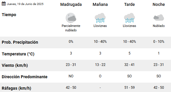 Por la tarde, el termómetro alcanzará los 5°C y el viento se intensificará desde el Suroeste, con velocidades de 32 a 41 km/h y ráfagas que podrían alcanzar entre 51 y 59 km/h. También se esperan lloviznas con una probabilidad del 10 al 40%.