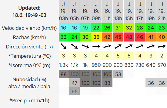 De acuerdo con Windguru, la temperatura oscilará entre los 3°C y 5°C a lo largo del día, mientras que el viento será un factor importante, con ráfagas que superarán los 40 km/h desde el mediodía.