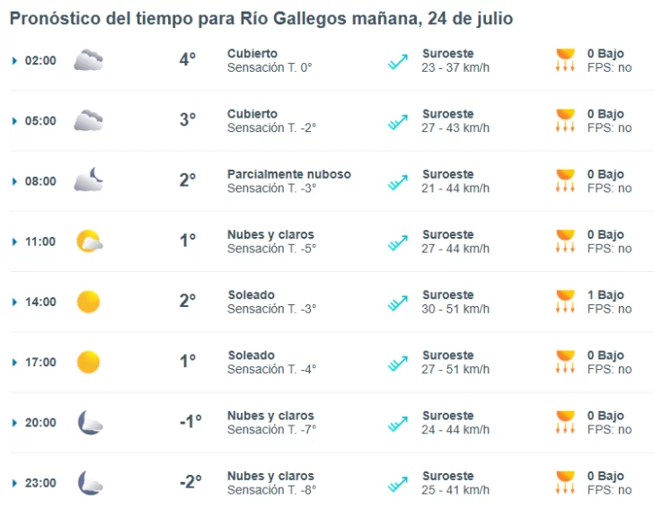 El Servicio Meteorológico Nacional (SMN) elaboró el pronóstico del tiempo para este jueves 24 de julio en la ciudad de Río Gallegos, y anunció que se espera una temperatura máxima de 2°C y una mínima de -2°C.