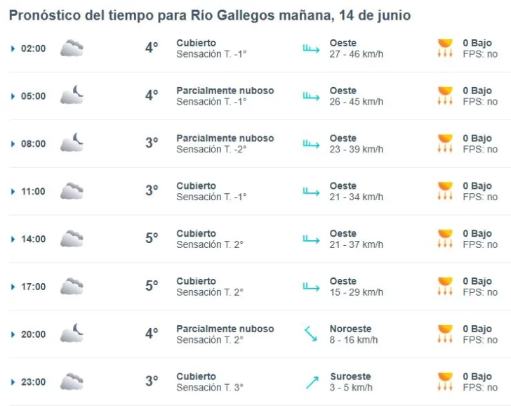 El Servicio Meteorológico Nacional (SMN) pronosticó para este sábado 14 de junio en la ciudad de Río Gallegos un día con temperaturas que irán desde los 1°C de mínima hasta los 6°C de máxima.
