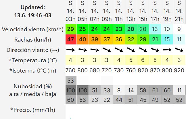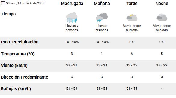 Durante la madrugada, la temperatura será de 3°C, con vientos del sector Oeste de entre 23 y 31 km/h y ráfagas de hasta 59 km/h. Habrá un 10-40% de probabilidad de lluvias y nevadas.