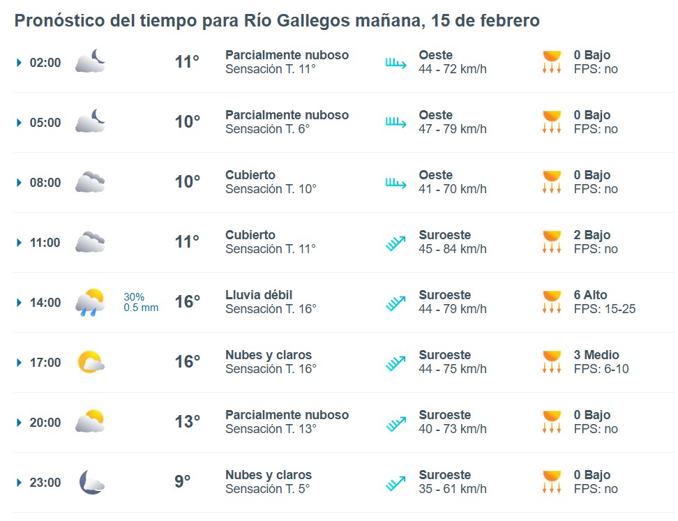 El Servicio Meteorológico Nacional (SMN) elaboró el pronóstico del tiempo para este sábado 15 de febrero en la ciudad de Río Gallegos, y anunció que se espera una temperatura máxima de 16°C y una mínima de 9°C.