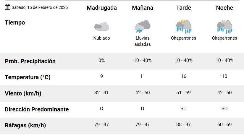 En la mañana, la temperatura será de 11°C y el viento del Oeste correrá con una velocidad de hasta 50 km/h y ráfagas de entre 79-87 km/h. Se prevén lluvias aisladas con una probabilidad de precipitación entre el 10-40%.