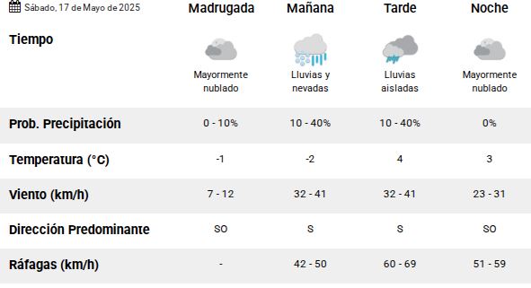 Por la tarde, la temperatura máxima será de 4°C, con vientos del Sur de hasta 41 km/h y ráfagas de entre 60-69 km/h. Habrá un 10-40% de probabilidad de lluvias aisladas.