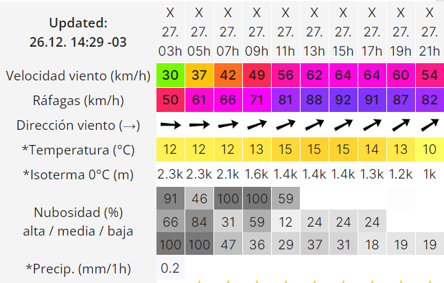 Este sitio aporta los datos del tiempo cada tres horas desde las 2:00 hasta las 23:00. Del cuadro se destaca que la temperatura máxima será de 16°C a las 14:00. La sensación térmica más baja por efecto del viento y la humedad será de 5º a las 23:00.
